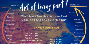 Happy to bring to you the Art of Living Part 1 or the Happiness retreat at the Common Street Spiritual Center, Natick. This 3-day, 3 hours each day (9 hours …